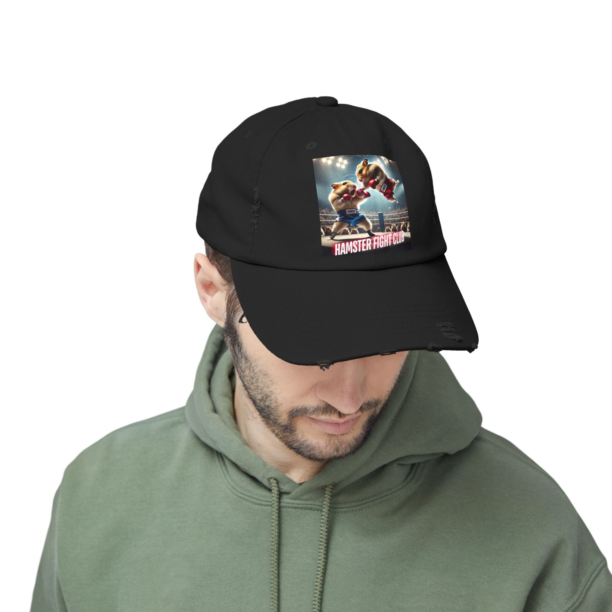 This unisex custom distressed hat features a bold "Hamster Fight Club" design. It offers a self-fabric hideaway strap and a metal D-ring slider for an adjustable, comfortable fit. Made from 100% cotton twill, this hat combines high-end durability with everyday style. Printed using Direct to Film (DTF) technology, it provides a smooth surface for vibrant, long-lasting prints. Each hat is uniquely distressed with color variations thanks to a special finishing process. Perfect for sun protection and making a statement.